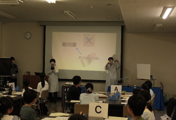 (公財)やまぐち産業振興財団が主催する「第37回夏休みジュニア科学教室」にUBE会場として協力しました。「透明ポリエチレンでカラフルな万華鏡をつくろう」という演目で24名の小中学生にポリエチレンの性質や、ポリエチレンと偏光板を用いて光が分かれる仕組みを説明。その後、各テーブルで万華鏡づくりを行いました。