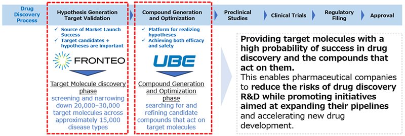 "FRONTEO excels at using proprietary AI and analytical methodologies to identify highly novel target molecules--those with no previously reported associations to diseases--from unstructured scientific literature. To translate these insights into tangible drug discovery, we need a partner with strong compound generation and optimization expertise. UBE is precisely that partner. By combining our idea generation with UBE's manufacturing excellence, we expect to achieve innovative drug discovery with unprecedented speed.